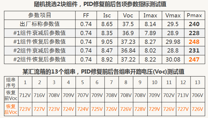阳光电源逆变器拥有自主专利PID效应解决方案,能保护组件可靠运行。逆变器在白天可以防护PID效应,在夜间还可以实现PID修复。通过在组件负极与地之间施加正电压,实现PID修复功能,将已经发生PID效应的组件恢复至正常状态。南方某沿海城市屋顶分布式光伏电站的案例中,由于前期设计未采用抗PID效应方案,并网一年后部分组件由于PID效应导致的衰减超过30%。通过采用阳光电源夜间PID修复解决方案,经过42小时的PID修复后,组件各项参数100%恢复正常。
