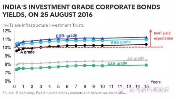 2015年5月Yieldco公司股价大范围崩盘之前,大多数美国Yieldcos型公司均能达到4-6%的收益率,这一水平接近上市机构和投资级公司债券的收益率。然而,印度投资级公司债券的长期收益率更高,大约在7.5-11.3%之间。此外,除非采用信用增级机制,印度基础设施债券的信用等级一般在BBB与A级之间。这意味着,印度公开市场投资者对InvIT产品收益率的心理预期在10%以上。