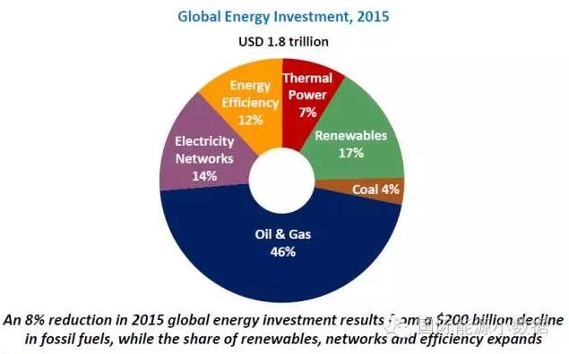 虽说油气投资大幅下降,但是在全球1.83万亿的能源投资总额中,油气投资占比达到46%。可再生能源投资占17%;火电发电厂投资占7%,电力输配网投资占14%;能效投资占12%;煤炭开采和运输投资仅占4%。