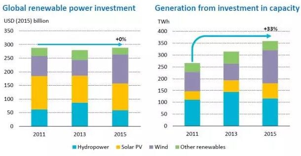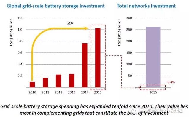 特别值得一提的是,2011年以来全球在可再生能源发电投资基本平稳,但是由于可再生能源成本的下降,每年新增的可再生能源发电量逐年增加,2015年超出2011年33%。此外,电力储能投资2015年超过100亿美元,是2010年的10倍;但是储能投资仅占电网投资的0.4%,还有很长的路要走。