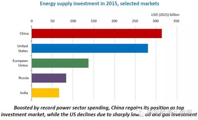 2015年中国能源领域总投资为3150亿美元,占全球能源总投资的17%,是世界上第一能源投资大国,远超位居第二的美国(2800亿美元)。在中国能源投资中,有900亿美元用于可再生能源发电;450亿美元用于化石能源电厂(主要是煤电厂,2015年新增煤电装机接近45吉瓦)。