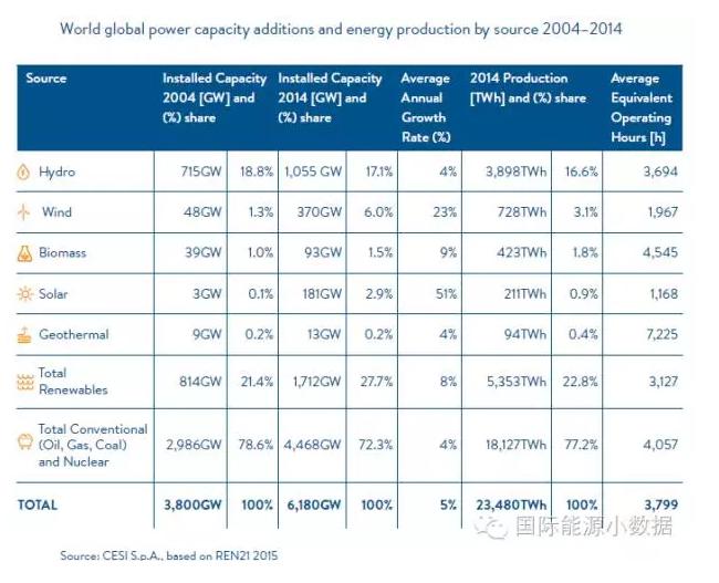 索比光伏网讯:根据世界能源理事会综合数据,2014年全球发电容量装机6180吉瓦,其中常规能源(煤、天然气、油、核电)装机4468吉瓦,占72.3%;各类可再生能源发电装机1712吉瓦,占27.7%。其中水电装机1055吉瓦(17.1%),风电装机370吉瓦(6.0%),太阳能装机181吉瓦(2.9%),生物质发电装机93吉瓦(1.5%),地热装机13吉瓦(0.2%)。