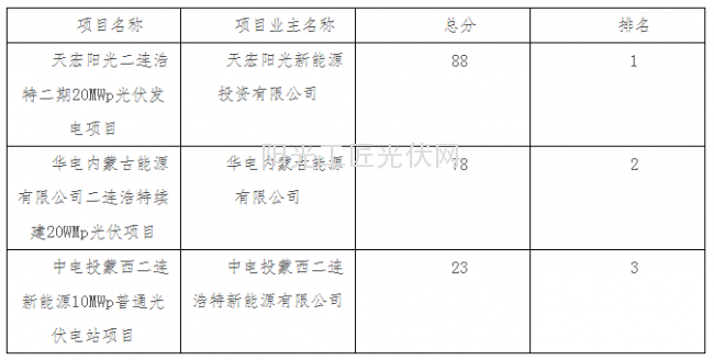二连浩特市普通光伏电站项目竞争性评选结果统计表
