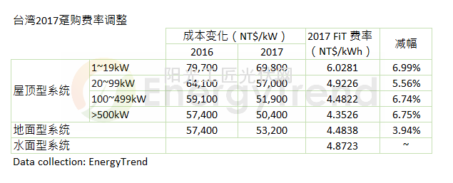 根据前次会议结论,考量2017年太阳光电建置成本将会下降,趸购费率调整如下表,整体有3.94%~6.99%不等的降幅。另一方面,明年起会新增水面型太阳能系统的趸购方案。