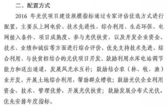 2016年5月30日,国家发展改革委、国家能源局发布 发改能源〔2016〕1163号 《国家发改委、国家能源局关于完善光伏发电规模管理和实行竞争方式配置项目的指导意见》 要求各省发展改革委(能源局)负责制定本省的普通光伏电站项目的竞争性配置办法,通过招标等竞争方式公开选择投资主体,竞争性比选、优选等竞争方式配置年度建设规模指标。