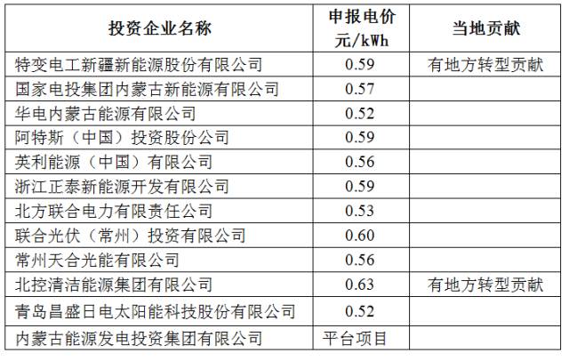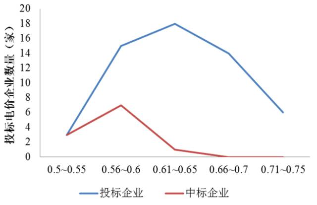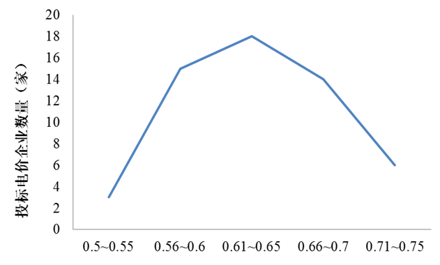 中标企业的电价在0.52~0.63元/kWh之间,具体分布如图2中所示。可见,包头项目的中标企业均为投标电价最低或较低的企业。