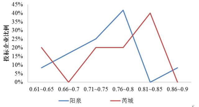 图3:阳泉、芮城中标电价在不同电价区间的分布百分比