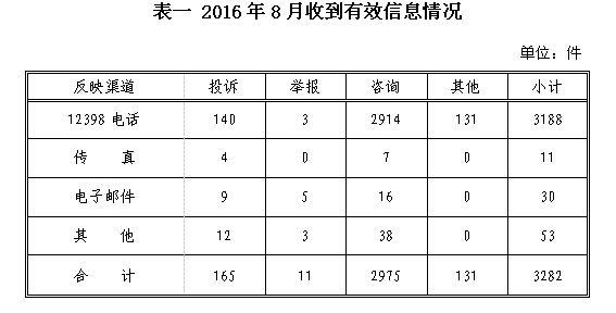 按反映渠道分类,12398电话3188件,传真11件,电子邮件30件,其他53件。(2016年8月收到有效信息情况见表一)