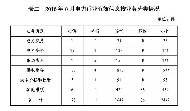 8月收到的有效信息中,电力行业类2842件,占86.60%;石油天然气行业类72件,占2.19%;新能源和可再生能源行业类108件,占3.29%;煤炭行业类1件,占0.03%;其他事项259件,占7.89%。