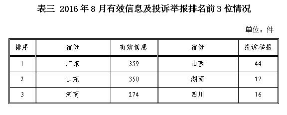 各省(自治区、直辖市)按照收到的有效信息数量排序,广东、山东、河南列全国前3位;按照投诉举报数量排序,山西、湖南、四川排在全国前3位。(2016年8月有效信息及投诉举报排名前3位情况见表三)