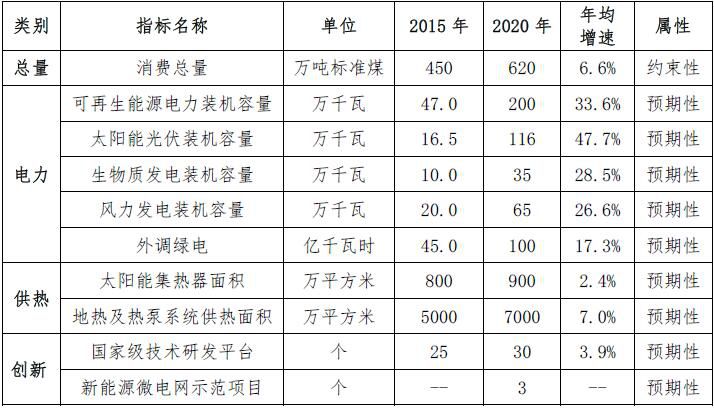 新建区域、新建建筑优先使用新能源和可再生能源,鼓励既有能源系统改造应用新能源和可再生能源,实现本地资源充分开发和外调绿电大幅消纳。到2020年,本市新能源和可再生能源开发利用总量达到620万吨标准煤,较2015年增长35%以上,占全市能源消费总量的比重达到8%以上。