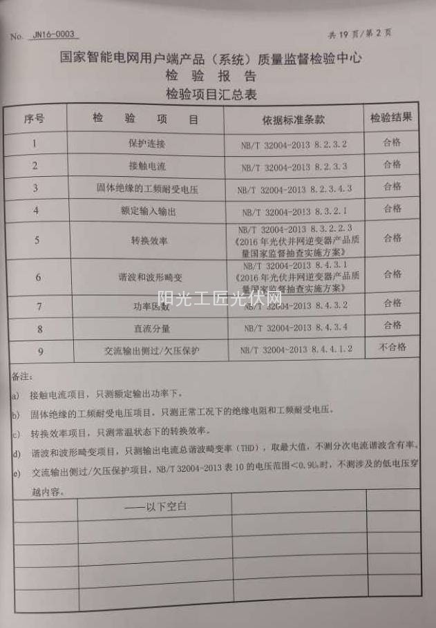 抽查发现有6批次产品不符合标准的规定,其中5批次“交流输出侧过/欠压保护”项目不合格、2批次“谐波和波形畸变”项目不合格。
