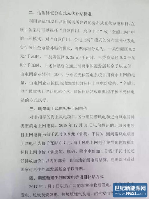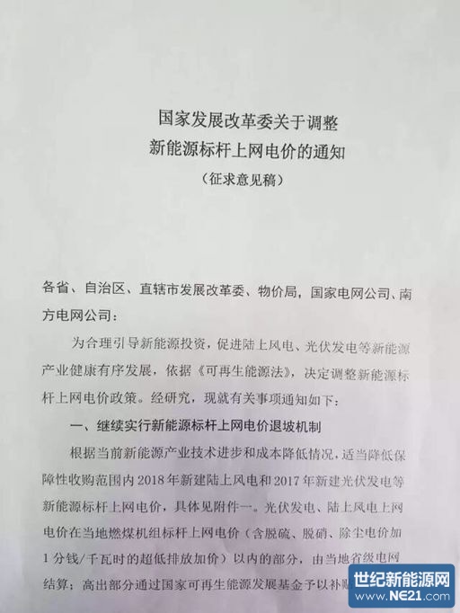 根据当前新能源产业技术进步和成本降低情况,适当降低保障性收购范围内2018年新建陆上风电和2017年新建光伏发电等新能源标杆上网电价,具体见附件一。光伏发电、陆上风电上网电价在当地燃煤机组标杆上网电价(含脱硫、脱硝、除尘电价加1分钱/千瓦时的超低排放加价)以内的部分,由当地省级电网结算;高出部分通过国家可再生能源发展基金予以补贴。