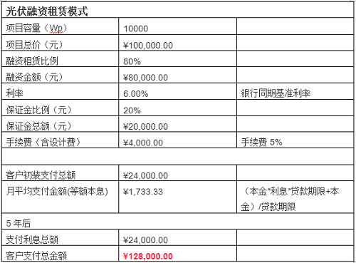 按照10KW容量的光伏系统计算,整体安装及设备总费用为10万元,业主A采取了光伏融资租赁的模式之后,首先需要为整个系统支付一定的安装费用,这是因为在光伏项目中,设备是作为融资租赁的主体,但安装无法计算入内,因此会按照总项目的80%进行融资租赁,业主A在项目开始前需要支付一定的安装费用,之后只要等待B公司上门安装并网之后,业主A就按照季度支付本金和利息给B公司,按照租赁期5年计算,5年到期之后,业主A可以选择购买系统继续使用。