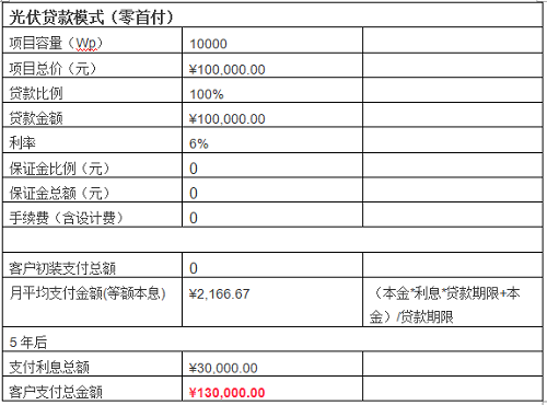 业主C也计划为自己的别墅屋顶安装一套10KW的光伏发电系统,而他选择的则是光伏贷款的方式,与一家已推出光伏贷产品的银行进行抵押贷款合作,直接贷款10万元安装光伏发电系统,然后每个月进行本金加利息的还款。