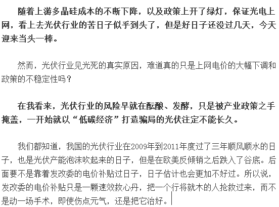 真正的病根还是来自于光伏产业自身。一个不靠补贴就赚不了钱的行业,一个以低碳为标志却实则高能耗、高成本的行业,从一开始就是一场骗局。