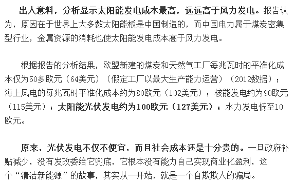 然而,令人意外的是,太阳能发电比风力发电甚至比水力发电的成本要高出很多——至少在欧盟是这样的。