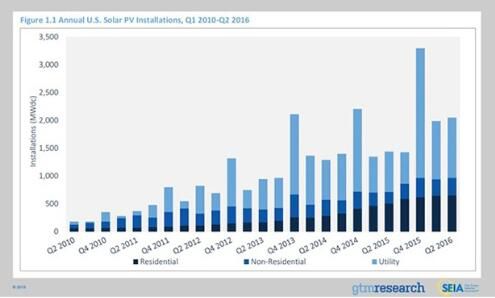 SEIA与美国GTM Research发布的最新光伏发电市场报告(U.S.Solar Market Insight Q2 2016)显示,2016年第二季度的导入容量为同比增长43%的2GW。并进一步预测2016年的市场规模将比上年增长85%,达到约14GW。其中70%以上是大规模电力业务用发电站(图2)。