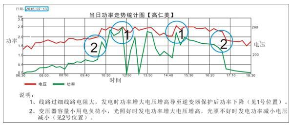 2.发电电压、电量与电网电压、变压器容量失配,日光辐射没有得到有效利用而弃光。当电网电压不稳,变压器容量小,带来光伏系统电压失配或容量超限,使逆变器处于“超压保护--重新启动”反复调整中,甚至停止工作,使光伏系统不能正常发电或发电脱网,降低了光电转换效率。巫溪县张啟发、张世万等项目户,均出现电网电压高于逆变器保护电压而发生弃光现象。如下功率曲线图所示。