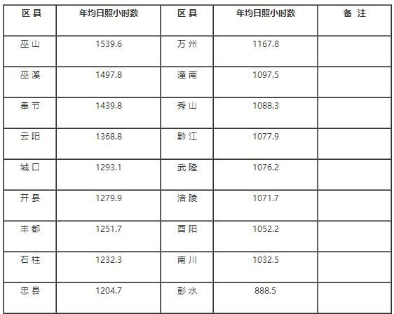 (一)在满足日照条件的适宜贫困地区推广光伏发电扶贫。我市属太阳能Ⅲ类资源区,光照资源总体上渝东好、渝西差,贫困山区好于主城区,据市气象局统计30年日照情况(见下表),巫山等9个贫困区县日照达1200至1500小时/年。按8元/w投资成本与发电收益计算,光伏发电投入产出比达12%以上,高于农村一般项目收益。目前,重庆光伏发电装机不足5兆瓦,仅为全国的0.0065%,与世界清洁能源大国德国达37%比相差甚远。光伏发电符合国家清洁低碳能源发展战略,我市潜力巨大,尤其是在缺乏稳定增收产业,光照资源好的贫困地区,可望建成稳定收入来源的村级扶贫产业。