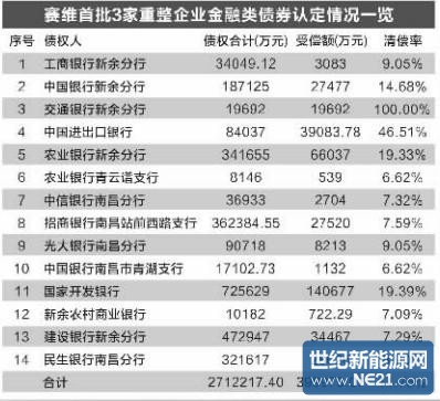 去年11月,新余市中院宣布,赛维集团旗下光伏硅、多晶硅、高科技、高科技(新余)四家公司实施破产重整。破产管理人由新余市高新技术产业开发区成立的破产清算组担任。除多晶硅公司由于不具备重组条件,走向破产清算外,其余三家公司重整方案于今年8月正式出炉,但在随后的第一轮表决中遭到多数债权银行否决。