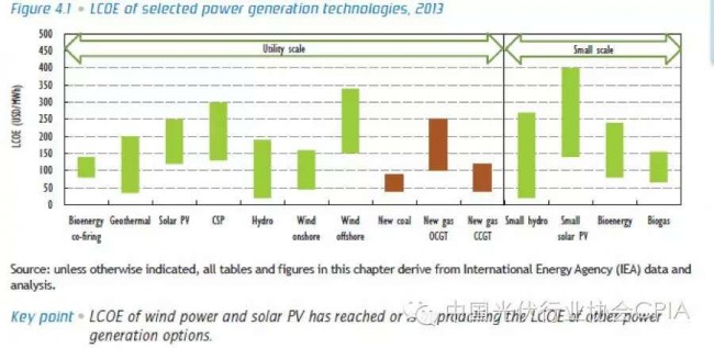 2016年6月,国际能源署(IEA)出版了名为《下一代风电和光伏:从成本到价值》[3]一书,其中明确指出,光伏电站项目建成后,发电的边际成本几乎为零。IEA另一篇名为《转型的力量》报告中指出,早在2013年,以“平准化成本”测算,光伏和风电成本已达到或接近其他能源成本[4]。