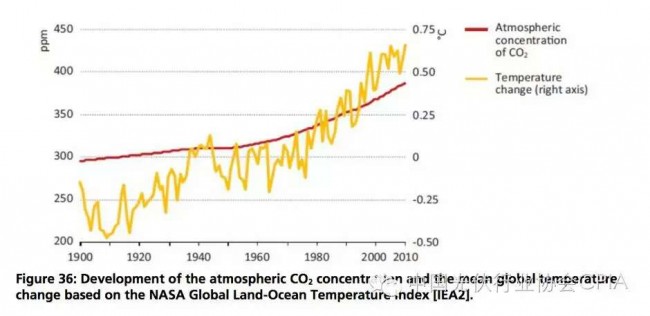 图2 1900-2010年大气中二氧化碳含量和全球平均温度的关系[5]