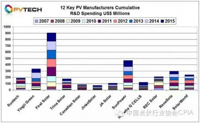 自2007年以来,光伏业内知名媒体PV-Tech跟踪了全球多家主要光伏组件制造商中的研发投入,如下表所示,中国光伏厂商在研发方面的支出名列前茅,十二名中有七家是中国企业,且研发投入呈逐年递增趋势。
