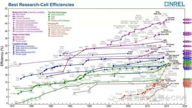 近年来,在内外部环境的共同推动下,我国光伏企业加大工艺技术研发力度,生产工艺水平不断进步。中国光伏产业通过技术研发、产业化生产在提升光伏电池组件效率的同时大大降低产品价格,经过15年的努力,使光伏发电效率提升了66%,光伏发电成本降低了90%。单晶及多晶电池技术持续改进,产业化效率分别达到19.8%和18.3%,钝化发射极背面接触、异质结、N型、多次印刷、背电极等技术路线加快发展;光伏组件封装及抗光致衰减技术不断改进,双面、双玻、无边框组件等自主创新产品不断涌现。