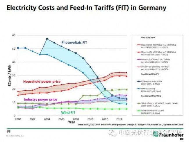 德国是全球第一个对光伏发电提供补贴的国家。通过产业政策支撑,德国在自然光照资源有限的情况下,光伏产业快速发展,迄今已实现累计装机容量40.3GW。在技术进步及市场竞争的推动下,德国光伏电价已由2010年的40欧分/度降至目前的8欧分/度,实现了平价上网。逐步降低退坡的补贴政策,为德国光伏产业发展提供了巨大的空间,推动了能源转型,优化了能源结构,落实了绿色发展。