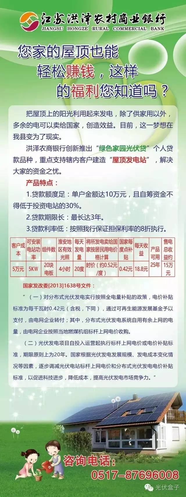 阜南农村商业银行在阜南县全县12个乡(镇)开展对乡镇认可的5000家贫困户贷款支持安装3KW太阳能光伏发电站,该项光伏产业扶贫贷款利率不上浮,按同档次人民银行公布的基准利率执行,每户最高限额8000元信用或保证贷款。