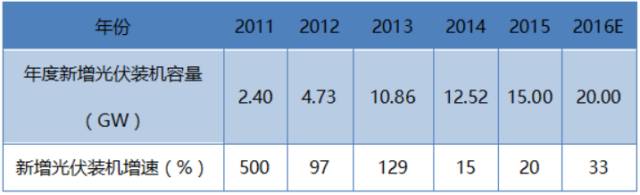 国内可再生能源支持政策始终在加码,制约光伏行业发展的电站质量、限发、补贴发放不及时等问题,都有望在“十三五”期间一并解决(国家能源局新能源和可再生能源司处长董秀芬宣布“十三五”光伏装机目标上调50%,即2020年光伏发电规模从之前的1亿千瓦上调至1.5亿千瓦)也就是说到2020年国内总规划装机规模为150GW。根据报告中数据显示,到2015年底,我国光伏累计装机超过43GW,也就是说未来5年内光伏发电行业的年复合增长率高达28.39%。