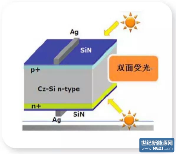 双面N型高效光伏电池是在N型单面电池基础上,通过正面硼扩散形成P+层,背面磷扩散形成N+层,最后形成N型单晶双面电池成片。目前N型双面电池正面平均效率达到21%,背面平均效率达到19%。比传统P单晶硅电池效率提升10%至30%之间。组件功率可达295W至384W之间。生命周期发电量可增加29%至67.7%之间。