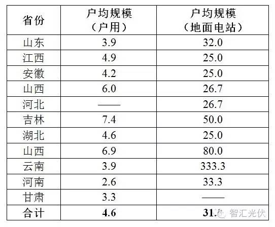各省的规模和帮扶户数比例,在之前国家提出户用、村级电站分别按照“3kW/户的规模、地面电站按照25kW/户”的规模基础上,根据各自的资源情况略微调整。其中,户用的在2.6~7.4kW/户之间,地面电站在25~80kW/户之间(云南暂不考虑)。
