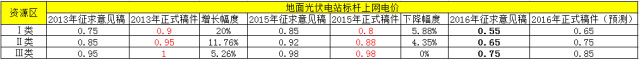 但通过对比2013年和2015年颁布的标杆电价,我们不难看出随着科技的进步,光伏成本不断降低,为防止产生过度补贴的现象,标杆电价的确是呈下降趋势的。不过乐观的小编依然预测正式文件下发时,Ⅰ类、Ⅱ类、Ⅲ类的标杆电价将会小幅增长为0.65、0.75、0.85元/千瓦时。