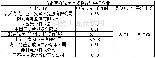 表四安徽两淮光伏领跑者中标企业及电价
