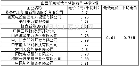 表五山西阳泉光伏领跑者中标企业及电价