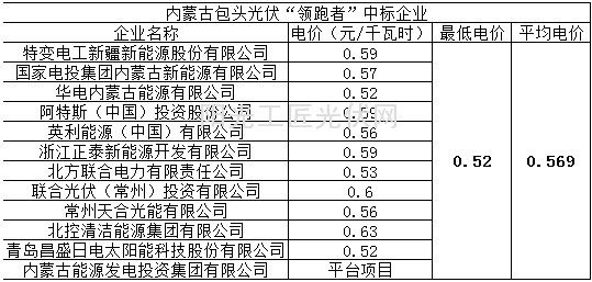 表七内蒙古包头光伏领跑者中标企业及电价