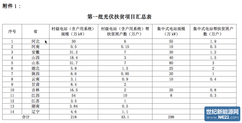 为贯彻落实中共中央国务院关于打赢脱贫攻坚战的决定和中央扶贫工作会议精神,加快推进光伏扶贫工程建设,我们组织各地区编制了光伏扶贫实施方案。经对各地区报送实施方案中各项目的基本条件进行审核,现将近期具备建设条件的第一批项目予以下达,并将有关要求通知如下: