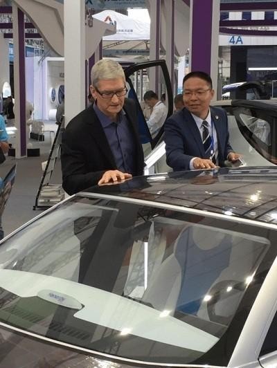 10 月 12 日,库克在深圳“双创周”中亮相,并在汉能展台仔细琢磨汉能太阳能动力汽车和砷化镓薄膜发电技术。