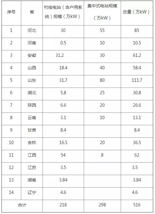 索比光伏网讯:国家能源局和国务院扶贫开发领导小组办公室昨日对外发布第一批光伏扶贫项目,总规模为516万千瓦,其中村级光伏电站(含户用)218万千瓦,集中式地面电站298万千瓦。这些项目分布在河北、安徽、山东、江西等14个省份,帮扶贫困户55万余户。