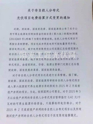 这份由江苏省电力公司下发的《关于非自然人分布式光伏项目电费结算方式变更的通知》中称,按照国网公司要求,对2015年2月底前投产并网的非自然人项目暂停颠覆0.42元/千瓦时的可再生能源补助资金,只结算标杆电价部分。如下图。