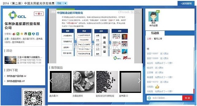 在“互联网+”时代,在线展作为最新形式的展会更符合时代潮流的需求,使沟通无时无处不在。从近三天的光伏在线展的火爆程度,不难看出这一创新模式的优势所在。正如保利协鑫副总裁吕锦标先生所言:“在线博览,低碳环保,大有可为。”