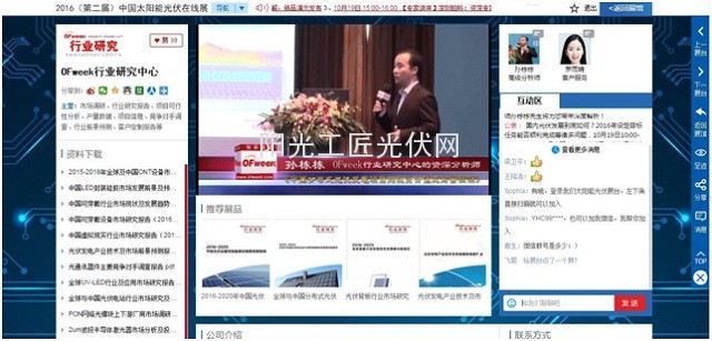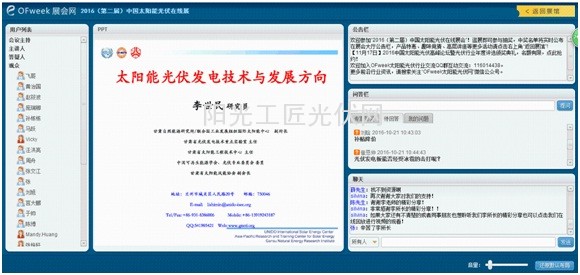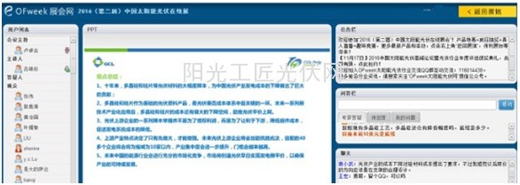 在线展期间同期举办了三场精彩的在线研讨会,分别是由OFweek行业研究中心高级分析师孙栋栋带来的《2016年中国光伏产业回顾及展望》、由保利协鑫控股有限公司副总裁吕锦标带来的《光伏发电平价上网对晶体硅材料业的要求》以及由甘肃省科学院自然能源研究所副所长李世民为大家带来的在线语音研讨会《太阳能光伏发电技术与发展方向》。行业专家在线分析光伏行业先进技术的发展动向,并在线答疑解惑,观众从中收获颇丰。