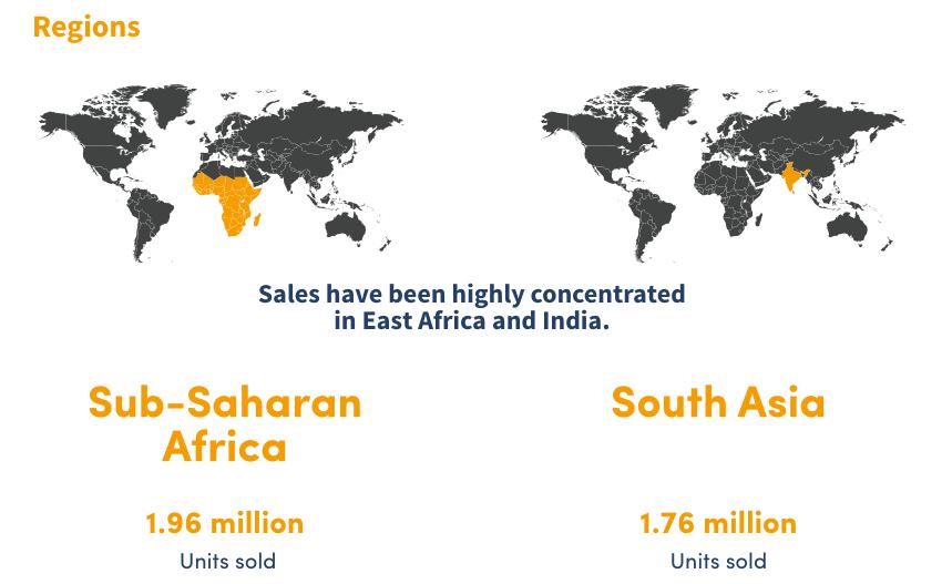 其中,在撒哈拉沙漠以南非洲地区中,东非占区域总销量的70%,占区域总收入的77%。而南亚地区的离网太阳能市场主要集中在印度市场,在区域销售总量176万单位中,印度占172万单位。