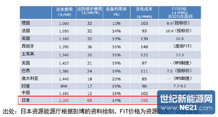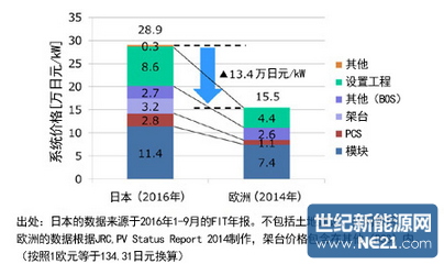 该报告书提出了目前日本国内的光伏系统费用约为30万日元/kW,是欧洲的两倍,应该将这一费用大幅降低到市场价格的水平,以促进由FIT向自力更生的转变的政策方向。