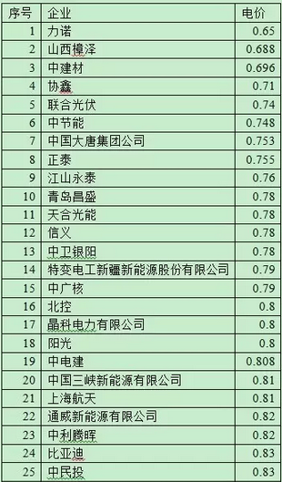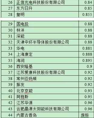 共有44家企业参加了安徽两淮领跑者项目的招标。各家的投标电价如下表所示。