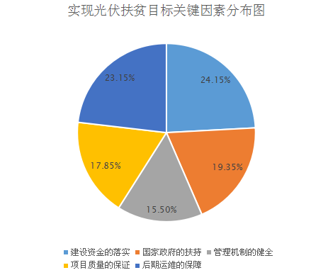 数据显示,24.15%的群众认为影响光伏扶贫目标实现的最重要的因素是建设资金的落实;23.15%的群众表示后期运维的保障是最关键的方面;另外国家政策的扶持,项目质量的保证以及管理机制的健全也是我国实现光伏扶贫目标的重要因素,分别占比19.35%、17.85%和15.50%。