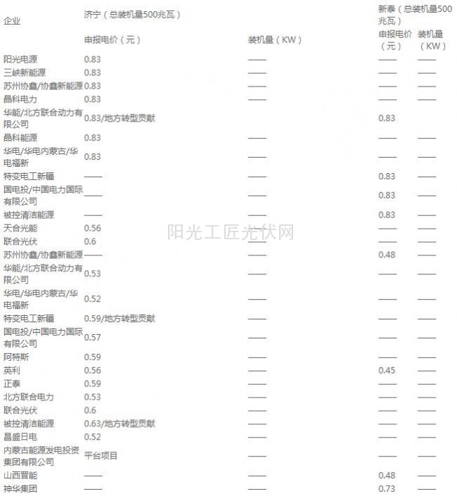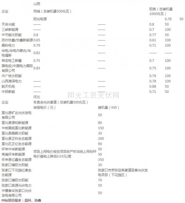 晶科电力拿下的项目为:阳泉、芮城、济宁、新泰、两淮;协鑫新能源拿下的项目为:阳泉、芮城、济宁、两淮和内蒙乌海。由于部分项目没有公开装机量,暂时无法得知总的得标数额是多少。不过,晶科和协鑫新能源毫无疑问是大赢家。