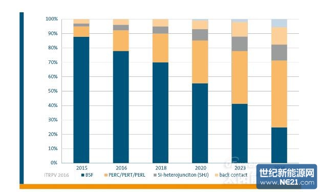 2015年,PERC及其两项相关技术PERT和PERL光伏电池在光伏电池技术市场仅占10%的市场份额,但2016年市场占比增至15%,预计2018年市场份额将升至20%,2020年将增长近30%。